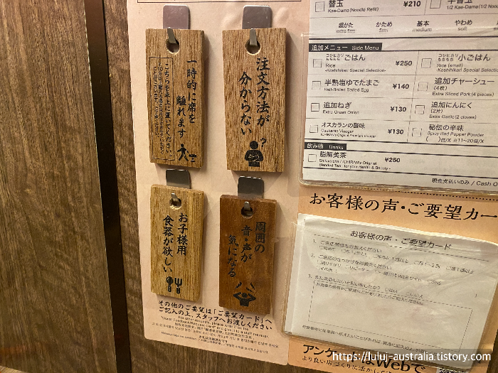 이렇게 바로 옆에 추가를 할 수 있는 주문서들이 있는데 먹으면서 이치란 특유의 나팔소리? 가 종종 들려와요. 그게 면 추가 했을 때 나는 주문 소리라고 하더라고요. 저도 심각하게 면 추가 할까 말까 고민했었는데 바로 돈키호테 쇼핑하고 오사카 돈카츠 맛집을 가기로 해서 추가는 하지 않았어요.