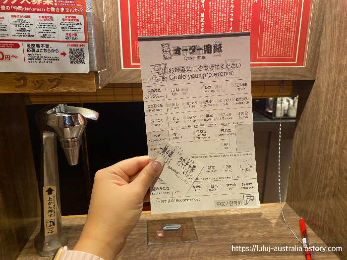 오전은 저희처럼 여행객이거나 젊은 일본인들 해장하러 오는 분위기였습니다. 일단 이치란 라멘 주문 방법은 주문 용지에다가 내가 원하는 라멘 맛과 매운 정도 그리고 마늘, 파, 차슈 그리고 면이 익힘 정도를 원하는 곳에 동그라미 치면 되는데요, 잘 모르겠다면 추천대로 동그라미 점선 되어있는 거 그대로 치면 됩니다. (이것도 한국어 있음)