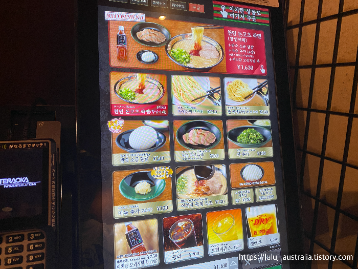 오사카 라멘 맛집 이치란 도톤보리점 별관은 본관보다 입구가 훨씬 작아요. 식당에 들어가면 키오스크가 2대 있고 직원분이 키오스크에서 주문하고 내려가면 된다고 하셔서 한국어 메뉴로 보고 골랐습니다. (오사카 이치란 웨이팅 길다고 들었는데 바로 들어가서 살짝 놀람.)
