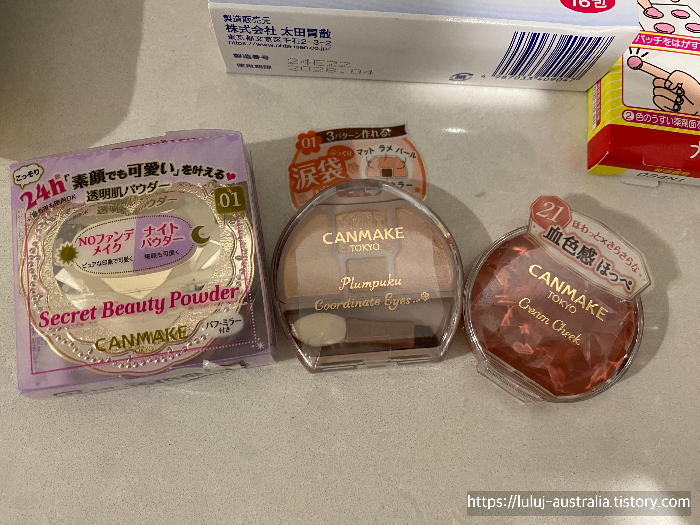 저는 우연히 닛폰바시역 안에 큰 화장품 가게에서 캔메이크 제품을 샀어요. 제일 왼쪽부터 캔메이크 24시간 시크릿 뷰티 파우더 가격은 935엔/ 캔메이크 플럼푸쿠 애교살 섀도우 팔레트 1호 가격은 792엔 /캔메이크 크림치즈 21호 가격은 638엔