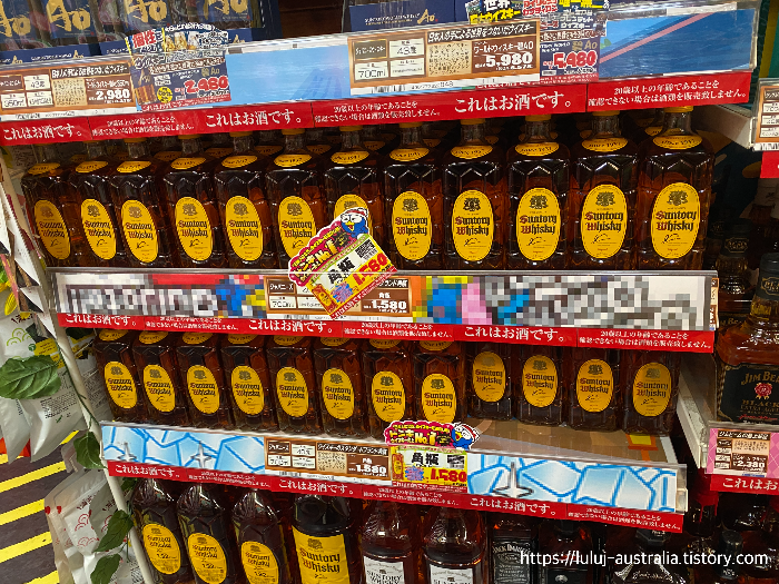 저희는 700ml 1580엔 가격의 산토리 위스키를 샀는데 이건 유리로 되어있고 아래에 진열된 페트병에 든 게 용량도 훨씬 많아서 더 효율적일 것 같아요.